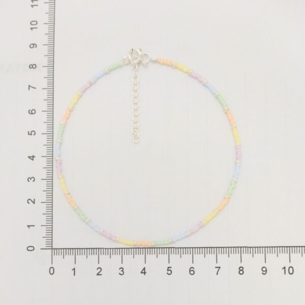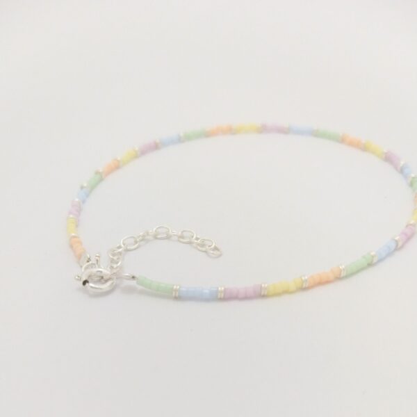 $10.949 ARSTobillera, mostacillas color pastel y rulitos plata 2,5mm, largo 24cm + alargue 4cm